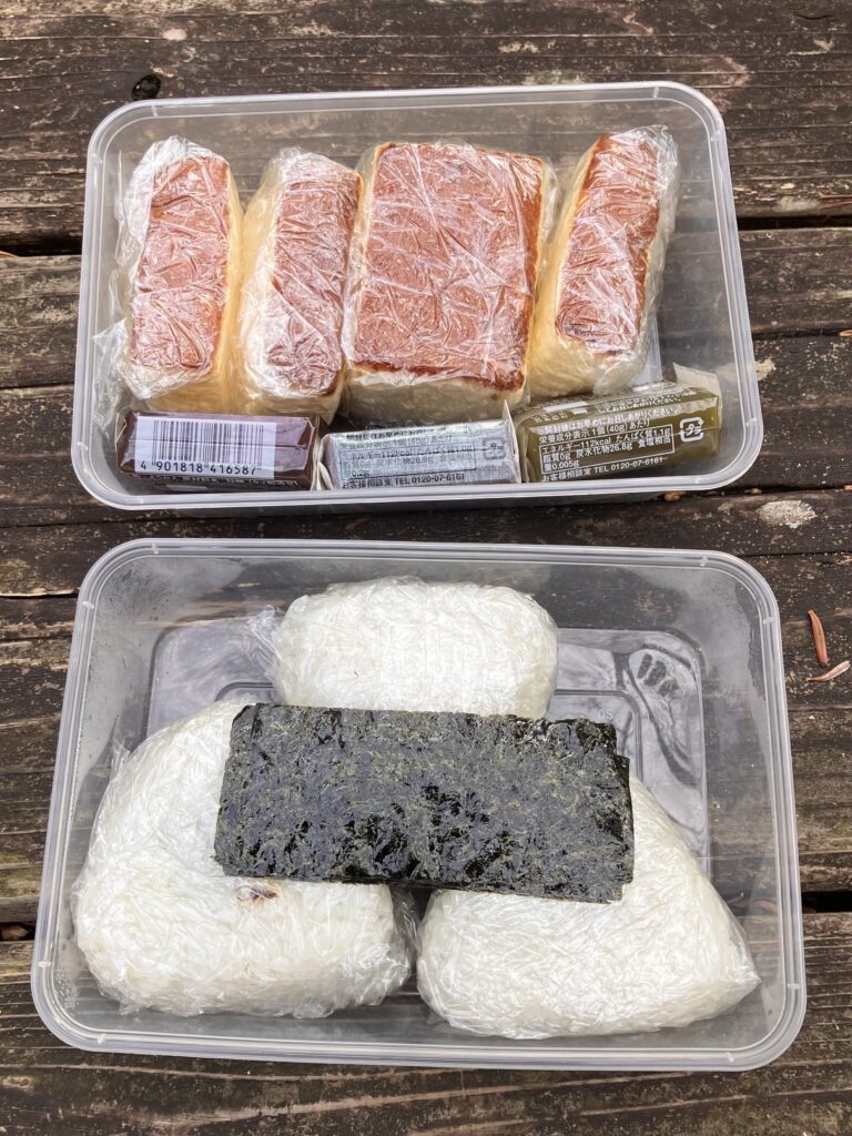 元日の食事は行動食であるカステラと羊羹、そしてDAISOの型で作ったおにぎり。