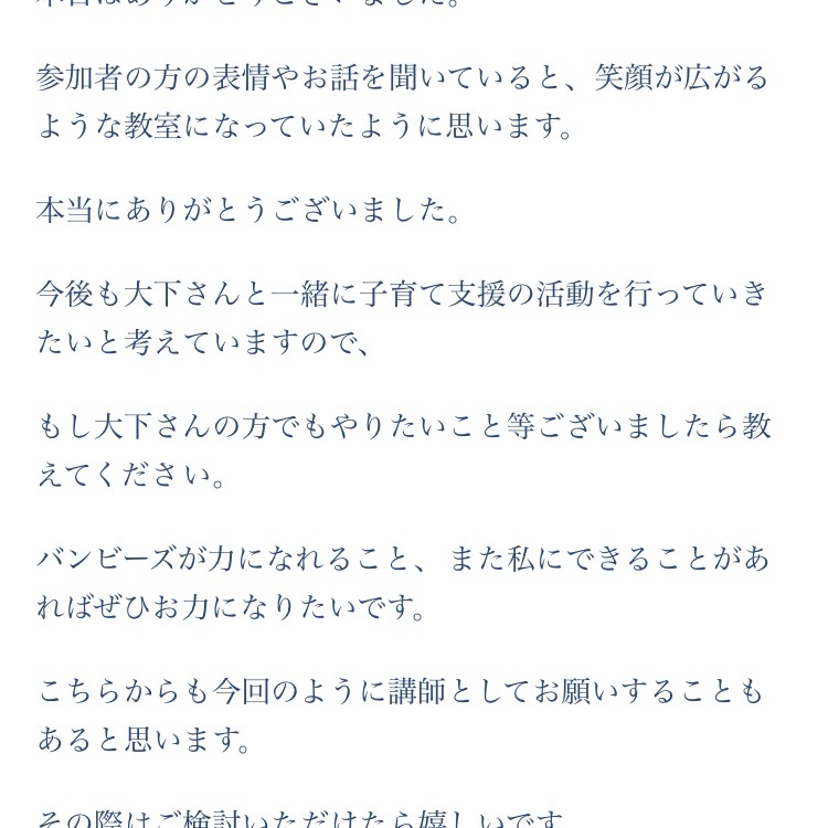 今回の教室を終えたあと、バンビーズの担当の方から、とても温かいメッセージをいただきました。