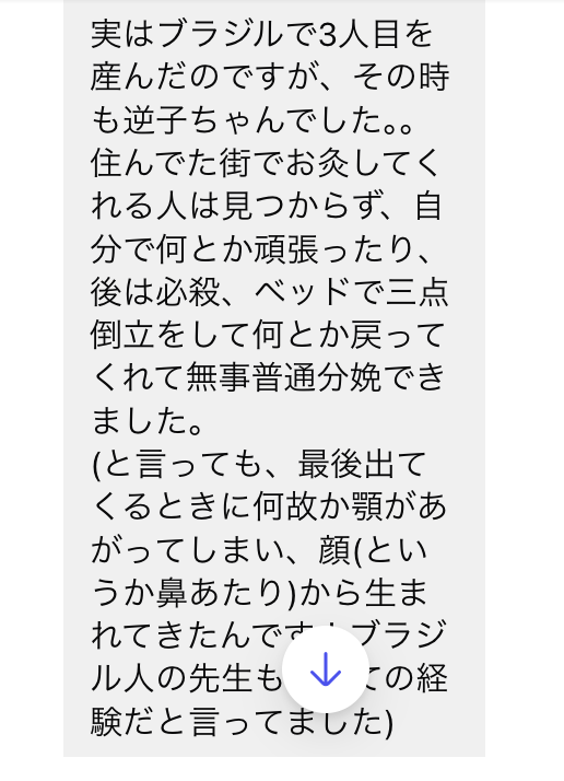 東京で逆子治療をした方なのですが、ブラジルでの3人目の出産時も逆子だったそうです。